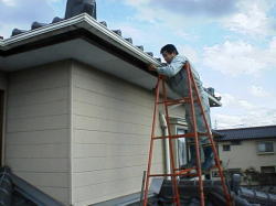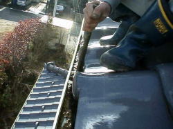 内吊り用軒樋がかかっており、雪により金具が曲がり軒樋の脱落が発生し補修いたしました。