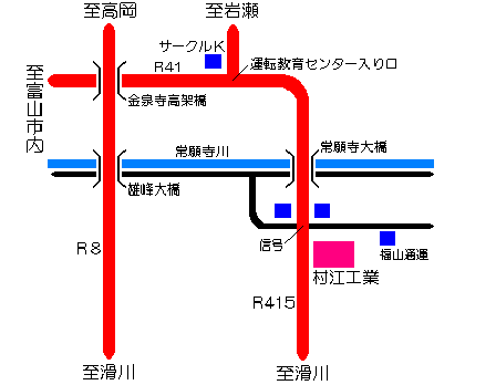 ●更に道なりに直進し、常願寺川をわたり一つ目の信号交差点の左向こう側に村江工業があります。